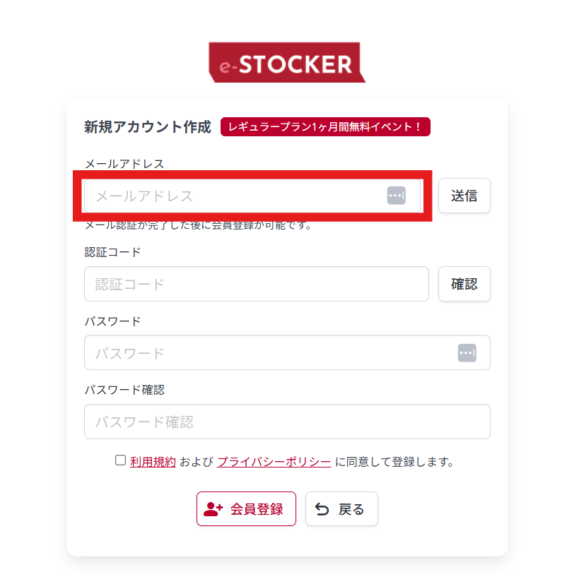 まずは、e-STOCKERにアクセスして「会員登録」をクリックしてください。