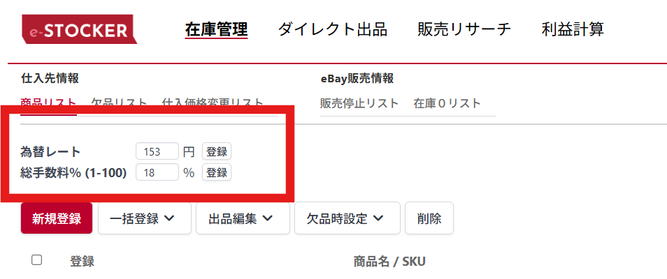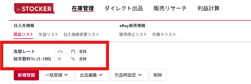 ebayと連携後、為替レートと総手数料設定しましょう。