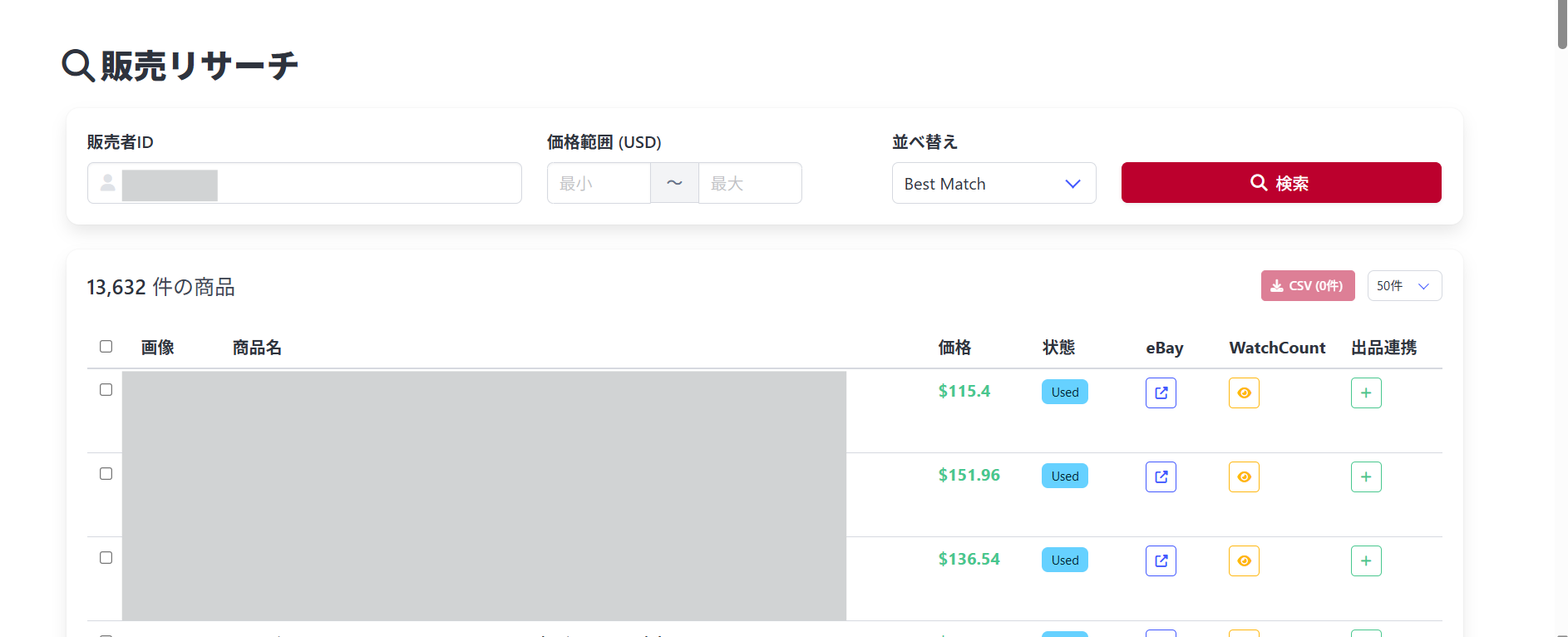 販売リサーチでは、「販売者ID」を入れるだけで、ライバルセラーが販売している商品や価格が丸わかりになります。