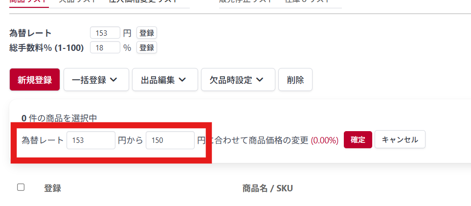 たとえば、為替が153円から150円になって価格変更をしたいときにに便利な機能が「為替価格変更」です。