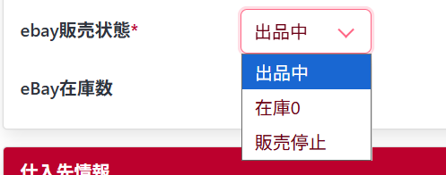 ebay販売状態は、デフォルトでは「出品中」になっていますが、「在庫0」や「販売停止」にも変更可能です。