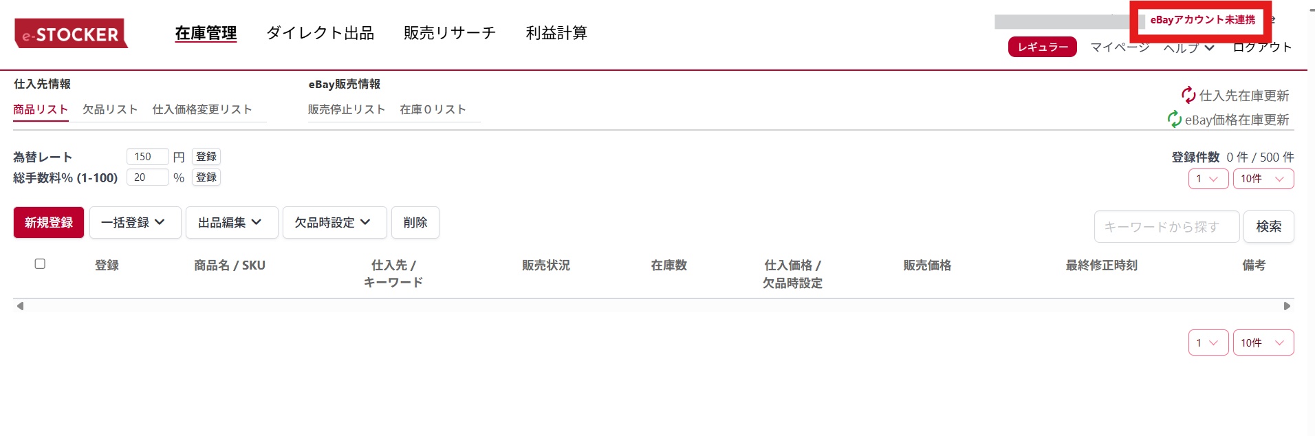 右上の部分が「ebayアカウント未連帯」となっていますね。