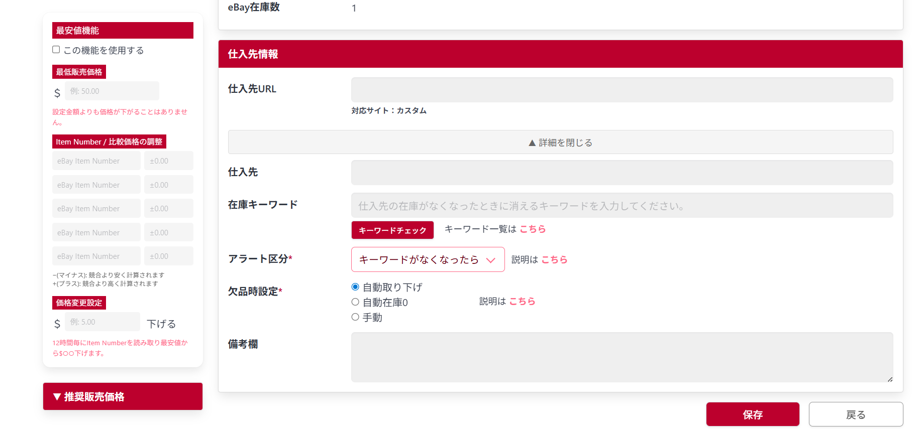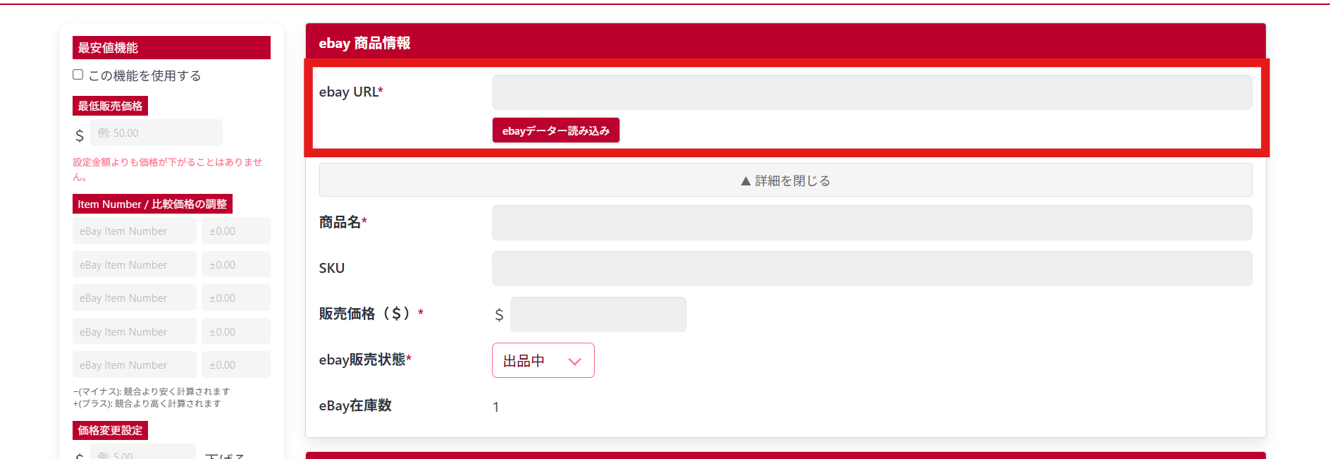 ebay URLの部分に、登録するebay商品のURLを入力してください。「ebayデーター読み込み」をクリックすることで現在の販売価格を読み込みます。