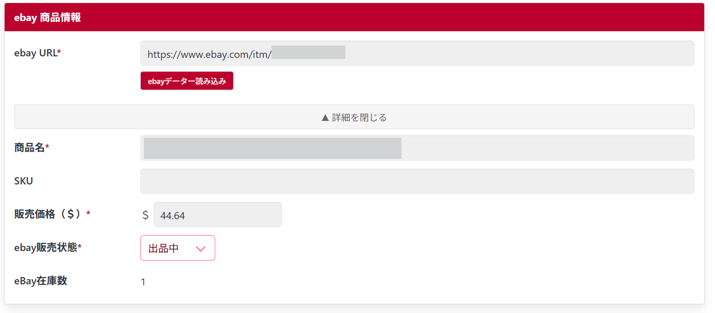実際に、ebay商品URLを入力したら、自動で商品名や販売価格が追加されました。