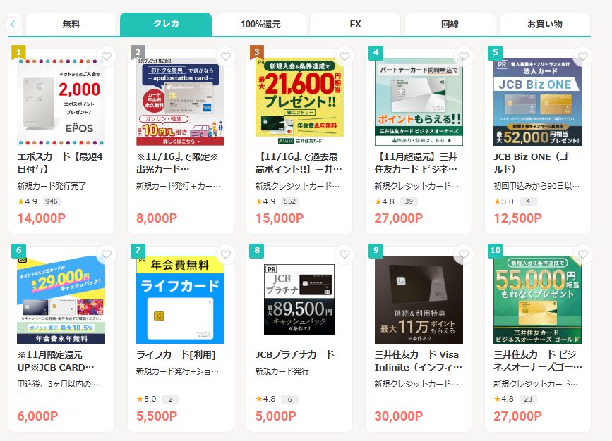 特にクレジットカード発行や口座開設などの高額案件は、数千〜1万ポイント以上も獲得できる可能性も。