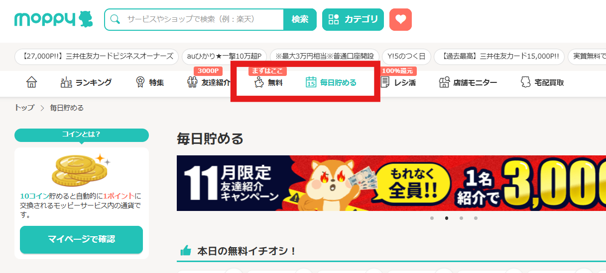 「無料」や「毎日貯める」をタップし、無料コンテンツでコツコツ稼ぐことができます。