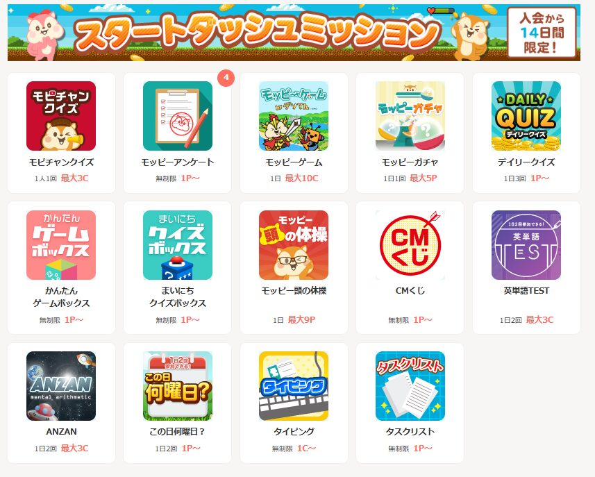 モッピーには、「モッピーガチャ」「毎日ポイントがもらえるゲーム」「簡単なアンケート」などポイントが貯まりやすいコンテンツが多いのが特徴です。