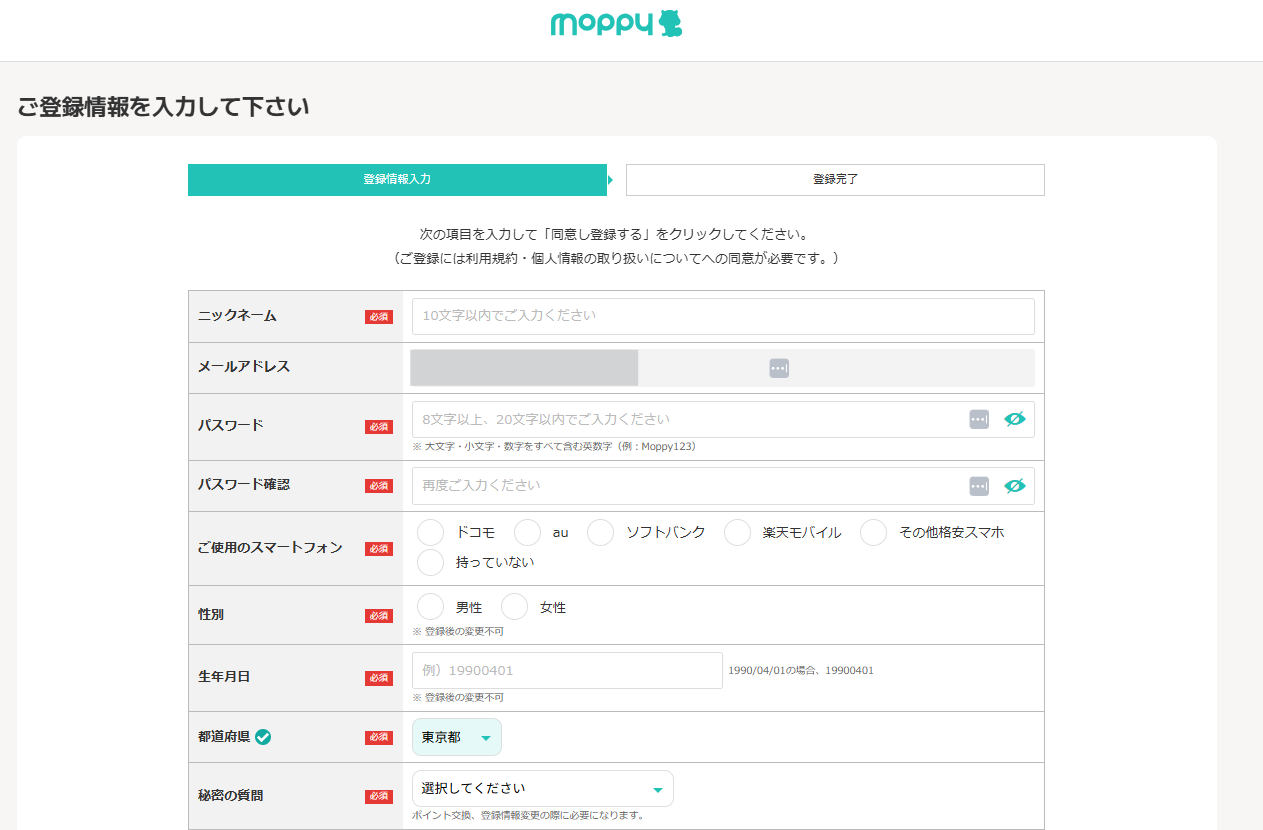 登録時には生年月日や都道府県に加えて「秘密の質問」も設定します。