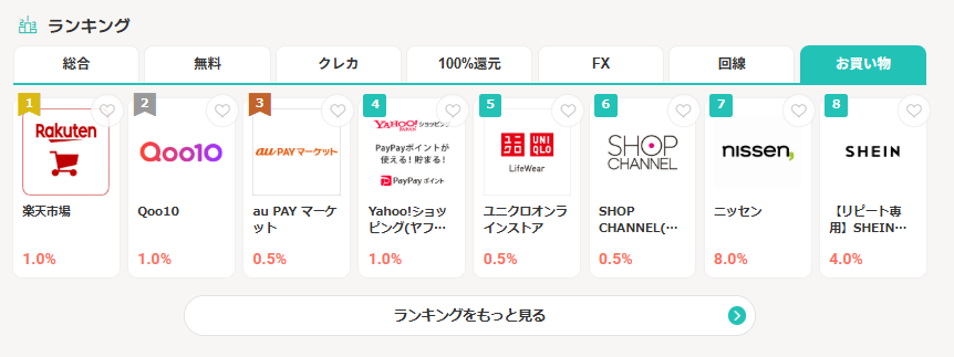 「楽天市場」や「Yahoo!ショッピング」など有名ショップとの提携も多く、普段のネットショッピングをするだけでポイントの二重取りも可能ですよ。