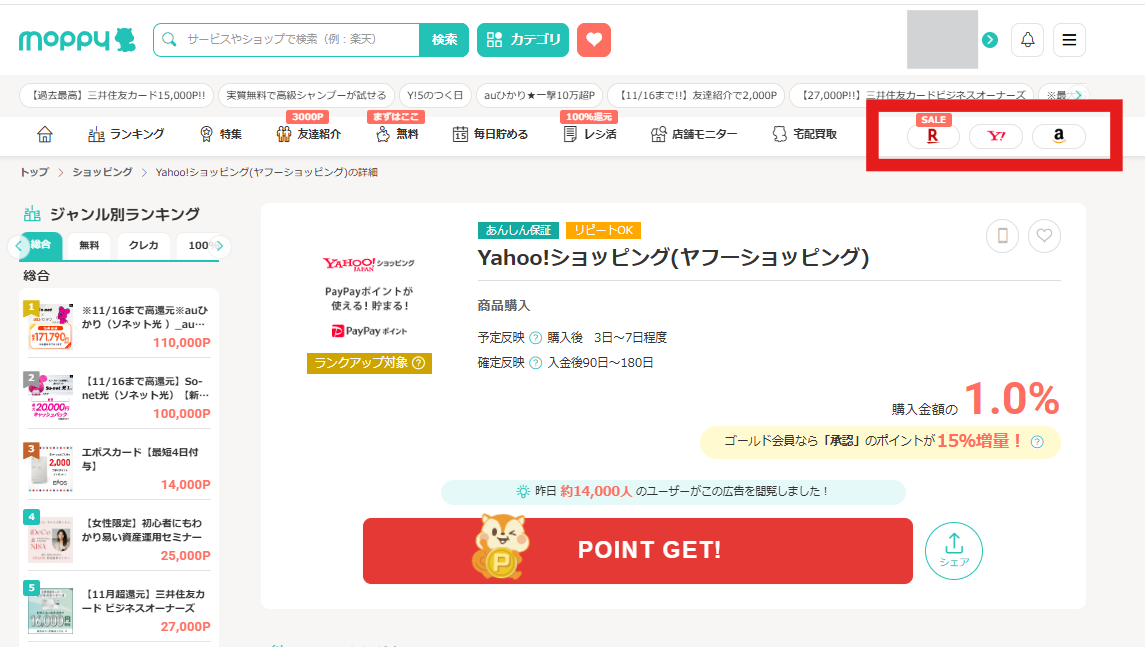 同じ広告が別のポイントサイトにも掲載されていることがありますが、モッピーのほうがポイント数が多いケースがよく見られます。