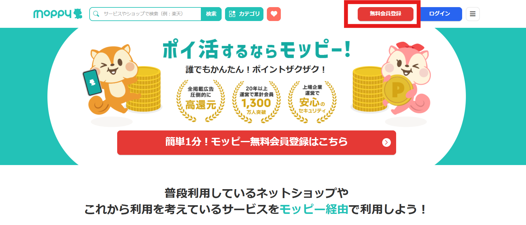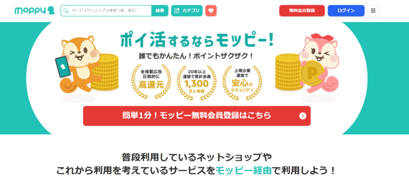 モッピーは 1P=1円のわかりやすいレート交換先60種類以上上場企業による運営で安心と、メリットが非常に大きいサービス。