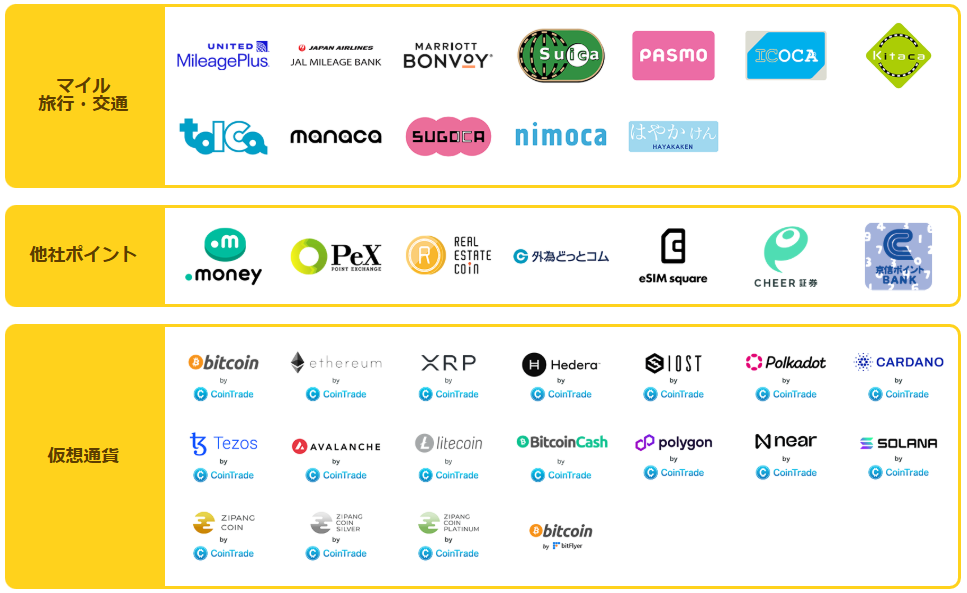 交換先の種類 約60種類(現金・電子マネー・ギフト券・暗号資産など)
