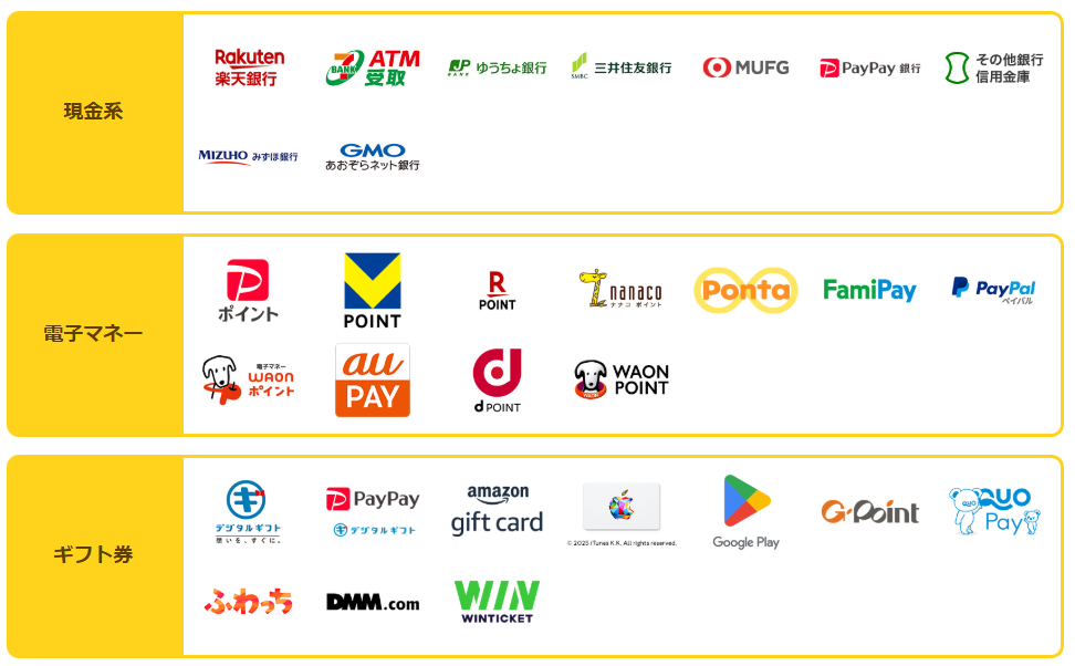交換先の種類 約60種類(現金・電子マネー・ギフト券・暗号資産など)