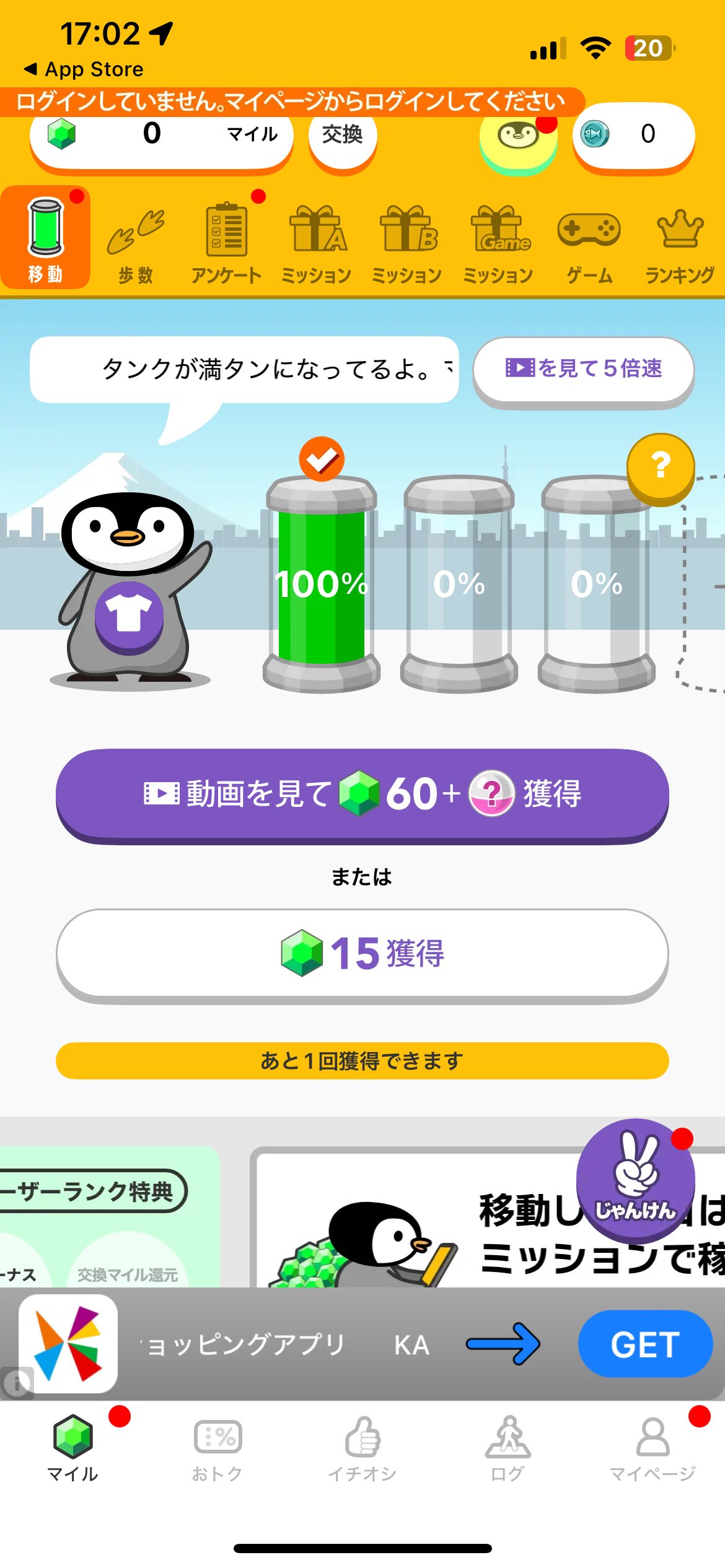 | 移動距離 | アプリを開いたまま移動すると、距離に応じてタンクがたまり、満タンでマイルを獲得 | タンク1本=15~100マイル | 移動前に「動画を見て5倍速」に設定 |